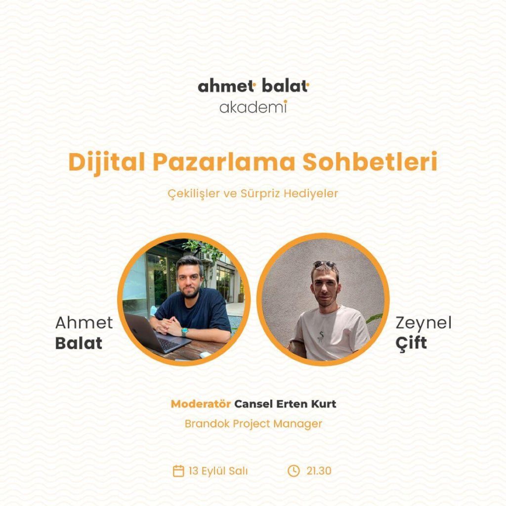 Dijital Pazarlama Sohbetleri 13 Eylül Salı 21.30’da Instagram’da gerçekleşecek! Canlı yayına Brandok ve Ahmet Balat Akademi Kurucu Ortakları Ahmet Balat ve Zeynel Çift katılacak. Yayını Brandok Proje Yöneticisi Cansel Erten Kurt modere edecek.